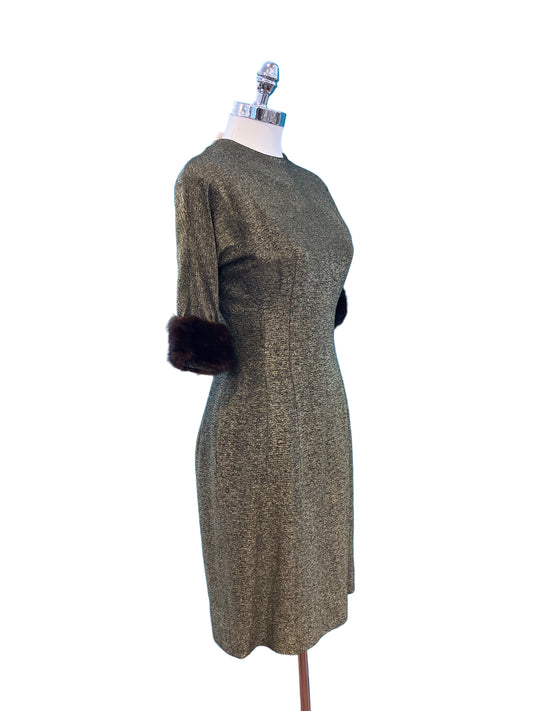 Vintage Jackie Morgan 1950s Metallic Dress with Fur Cuffs
