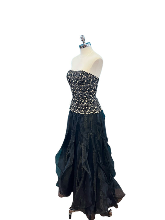 Vintage Jessica McClintock for Gunne Sax Black and Gold Appliqué Strapless Ballgown w/ Iridescent Ruffle Skirt Size 5